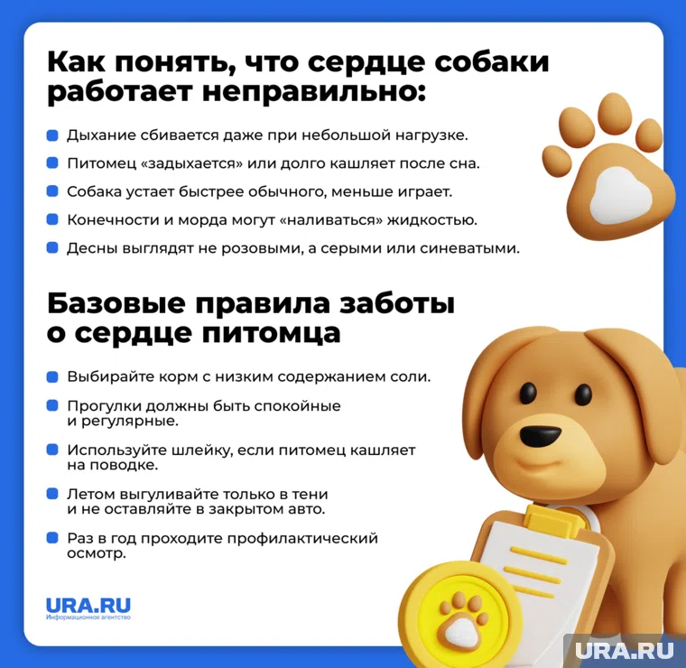 Одышка на прогулке, «сердечный» кашель по утрам, синюшные десны и внезапная слабость у собаки — чаще всего не усталость, а возможная сердечная недостаточность, которая без лечения доходит до отека легких и обмороков. URA.RU разобрало болезни сердца у собак: симптомы и первые признаки, что делать владельцу, какую диагностику пройти, лечение и профилактику. Подробнее — в материале.