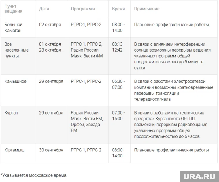 «Кратковременные отключения телерадиосигнала. Все населенные пункты Курганской области 1 октября — 23 октября. Программы: РТРС-1, РТРС-2, Радио России, Маяк, Вести ФМ. В связи с влиянием интерференции солнца возможны перерывы вещания указанных программ общей продолжительностью до пяти минут в сутки», — написано на сайте.