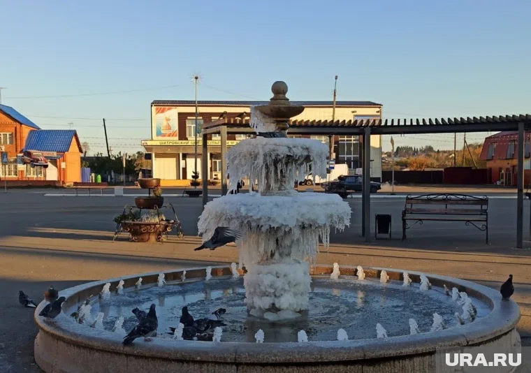 «В Шатрово замерз фонтан», — написано в tg-канале «KGN45 I КУРГАН». К посту прикреплено фото, на котором фонтан покрыт льдом, свисают большие сосульки. Вокруг летают голуби и пьют оставшуюся воду из фонтана.