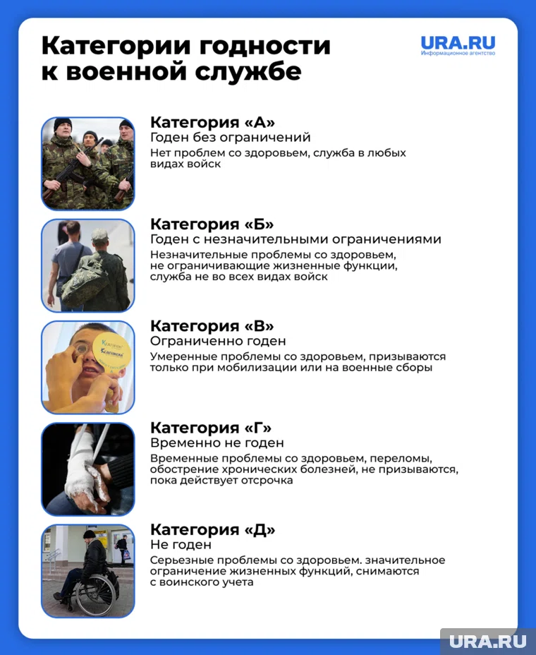 Всего есть пять категорий годности. Подробнее о них, какие бывают и с какими не берут в армию — в материале URA.RU.