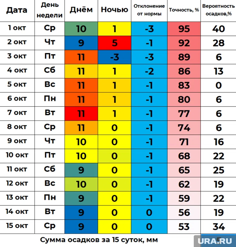 «Прогнозируется, что с 1 по 15 октября средняя температура в городе составит плюс 5, что на 1 градус ниже нормы. За этот период выпадет до 5 мм осадков, что составляет всего 30% от нормы», — сообщает telegram-канал «Погода 45».