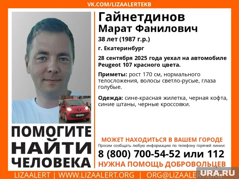 В Екатеринбурге объявили в розыск 38-летнего Марата Гайнетдинова, пропавшего 28 сентября. Мужчина уехал в неизвестном направлении на авто Peugeot 107 и пропал, рассказали в поисково-спасательном отряде «ЛизаАлерт».