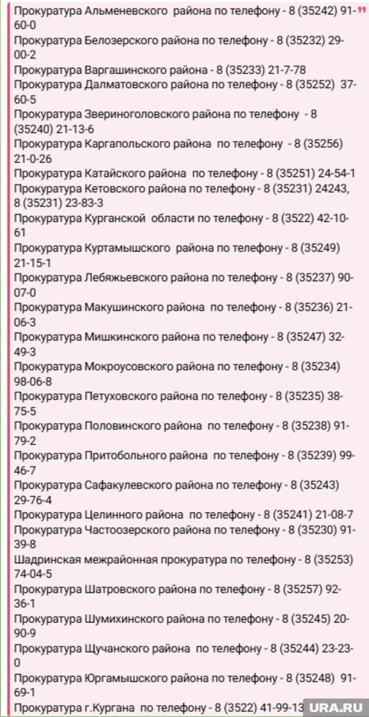 «В прокуратуре Курганской области и территориальных прокуратурах в период с 1 октября по 15 октября организована работа „горячей линии“ по вопросам своевременной и качественной подачи тепла в жилые помещения, а также надежности работы коммунальной инфраструктуры, обеспечивающей теплоснабжение жилого фонда и других социально значимых объектов. Сообщить о нарушениях можно в будние дни с 09:00 до 18:00 (обеденный перерыв с 13:00 до 13:45)», — пишет ведомство.