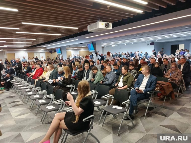 По сравнению с прошлым годом помещение больше, но мест все равно не хватает, многие гости стоят у стен и в конце зала. Сегодня Лебедев будет говорить о благоустройстве парков.