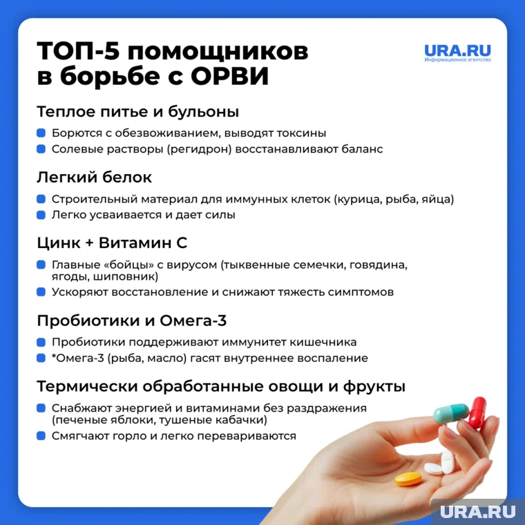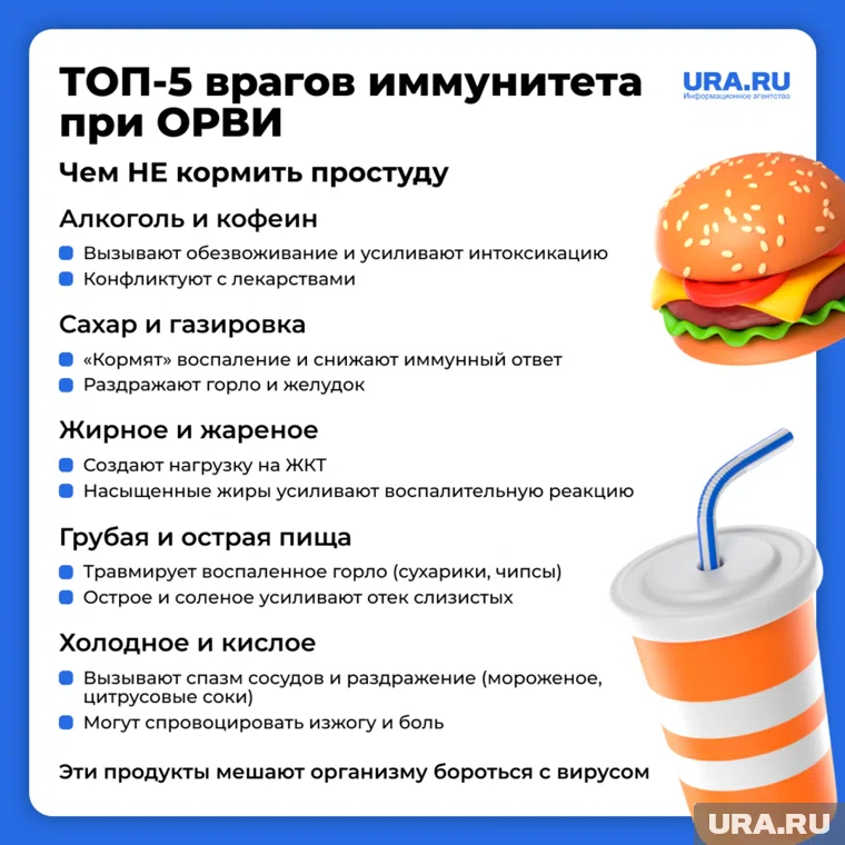 Осень — сезон чихов и соплей. И прежде чем скупать таблетки и пить чай с лимоном, стоит проверить холодильник. Некоторые «безобидные» продукты превращают обычную простуду в затяжную болезнь с осложнениями. Какая еда работает против вашего иммунитета, а какая позволит быстрее восстановиться, URA.RU рассказала диетолог Лариса Никитина.