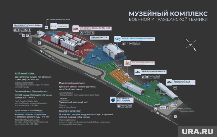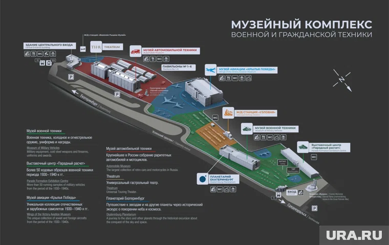 Музей авиации «Крылья Победы» — площадка с самолетами времен Великой Отечественной войны и иностранными экспонатами, выставочный центр «Парадный расчет» — здесь находятся ходовые образцы военной техники 1930-40-х годов, которые ежегодно участвуют в Дне Победы в Верхней Пышме. Также есть планетарий и открытая экспозиционная площадка на площади 13 га, где представлены советские танки, сверхзвуковые истребители, артиллерия, военно-морской флот, система противовоздушной обороны, техника «ленд-лиза», инженерные машины, железнодорожная и карьерная техника.