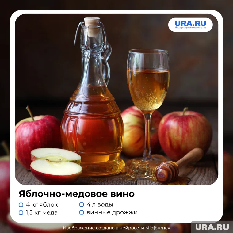 Приготовление: яблоки натереть, смешать с медом и водой, добавить дрожжи. Брожение — около месяца, выдержка — 5–6 месяцев.