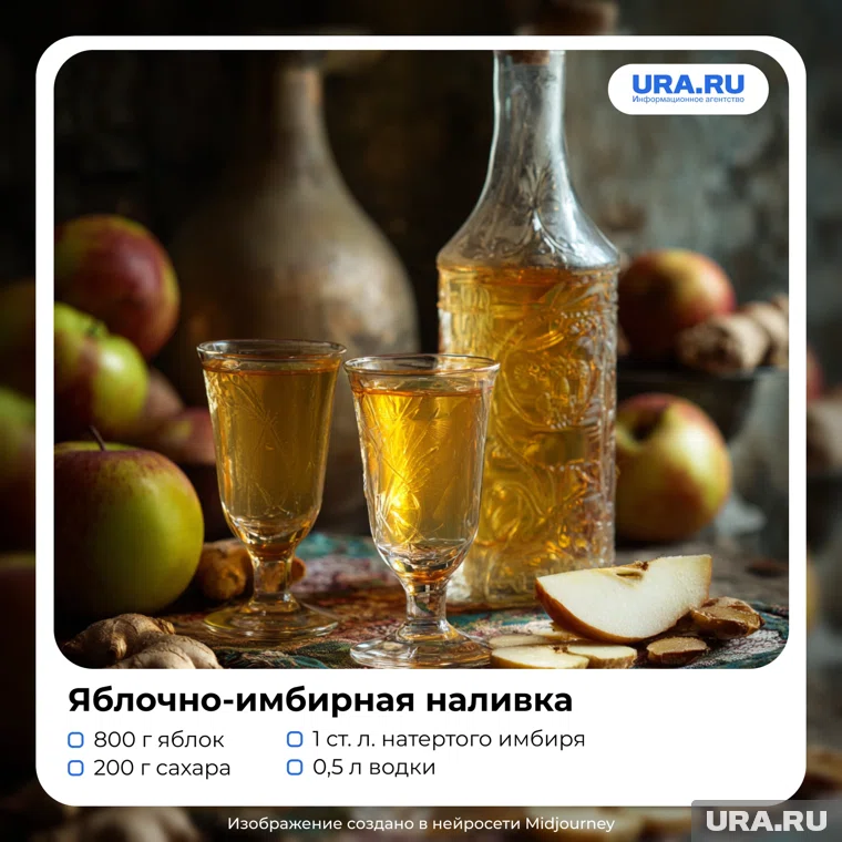 Приготовление: яблоки и имбирь залить водкой, добавить сахар, настоять 4 недели. Процедить и разлить по бутылкам.