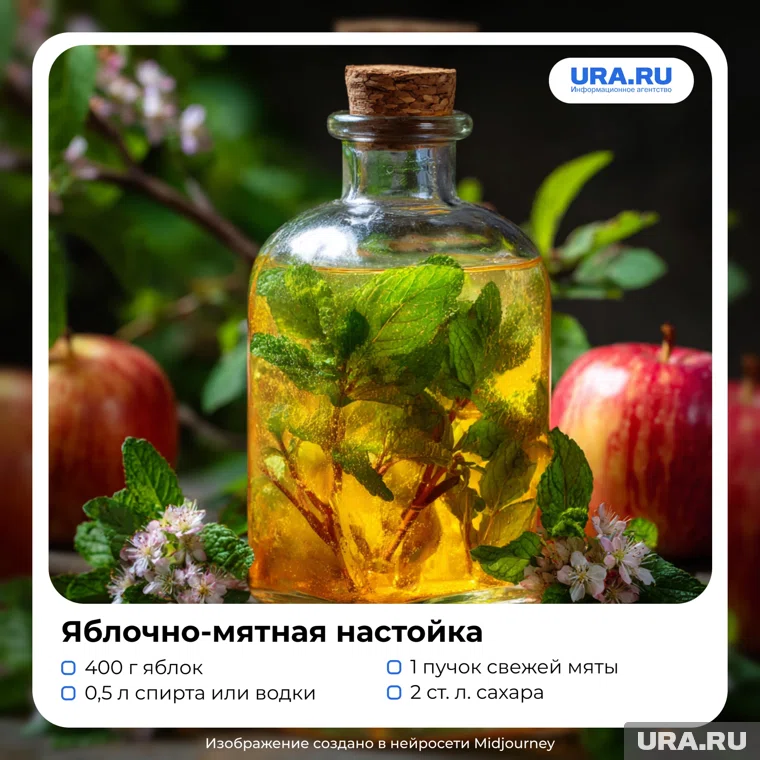 Приготовление: яблоки нарезать кубиками, смешать с мятой и сахаром, залить спиртом. Настаивать 4 недели, затем процедить.