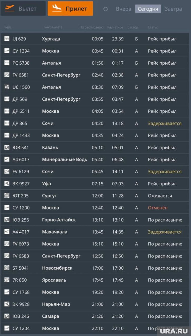 «Из Перми задерживаются рейсы до Санкт-Петербурга, Сочи и Минвод. Отменен самолет до Москвы и обратно. Кроме того, на прилет отложены два рейса из Сочи и один из Махачкалы», — сказано на онлайн-табло пермского аэропорта.