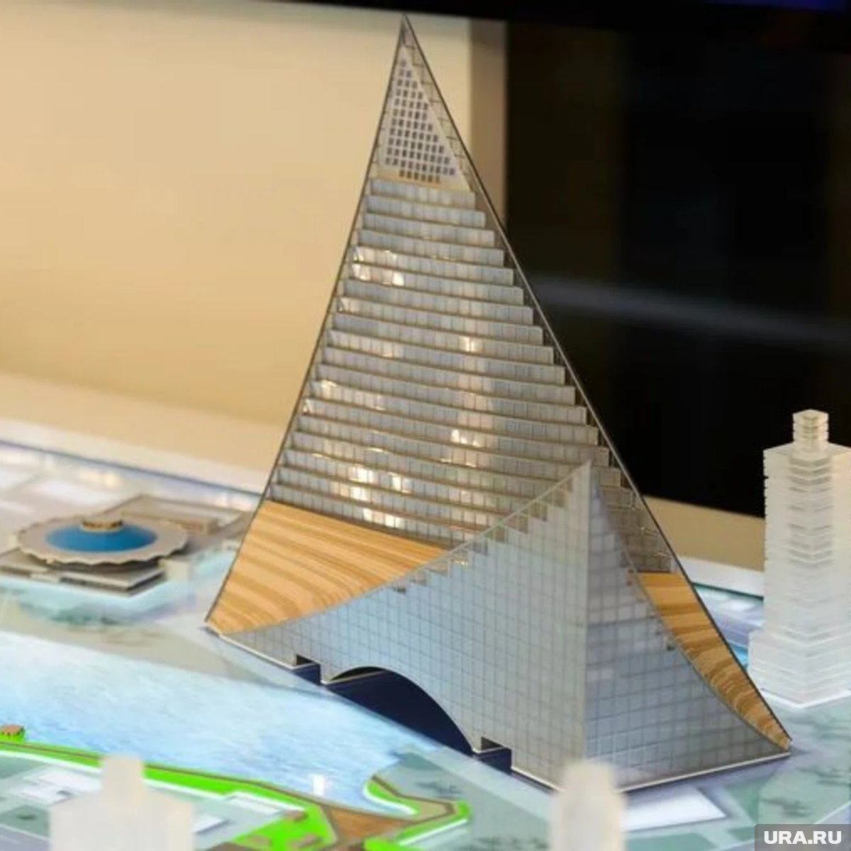 Дубровский грезил парящим над рекой воздушным замком над рекой площадью 100-110 тысяч кв. метров. По задумке две башни высотой 170 и 85 метров, соединенные крытым мостом, должны были напоминать парус, который расправился над Миассом. Другая ассоциация связана с крыльями по обеим сторонам реки. У каждой функциональной зоны здания планировали поставить свою входную группу. Архитекторы замыслили создать систему из нескольких десятков лифтов, в том числе панорамных.