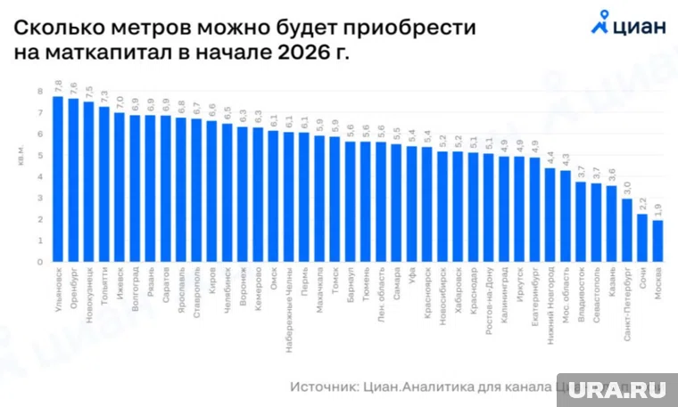 В целом по России больше квадратных метров по маткапиталу получится купить в Ульяновске (7,8), Оренбурге (7,6), Новокузнецке (7,5%). При этом менее четырех квадратных метров будут доступны по маткапиталу в Казани (3,6), Санкт-Петербурге (3), Сочи (2,2) и Москве (1,9).