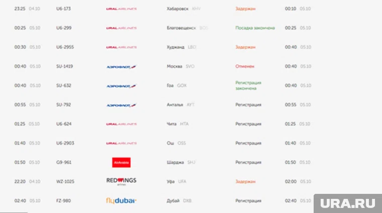 Согласно расписанию, позже назначенного времени вылетят рейсы «Уральских авиалиний» в Хабаровск и Худжанд. Самолет Red Wings в Уфу также покинет Екатеринбург с большой задержкой. Рейс «Аэрофлота» в Москву отменили полностью.