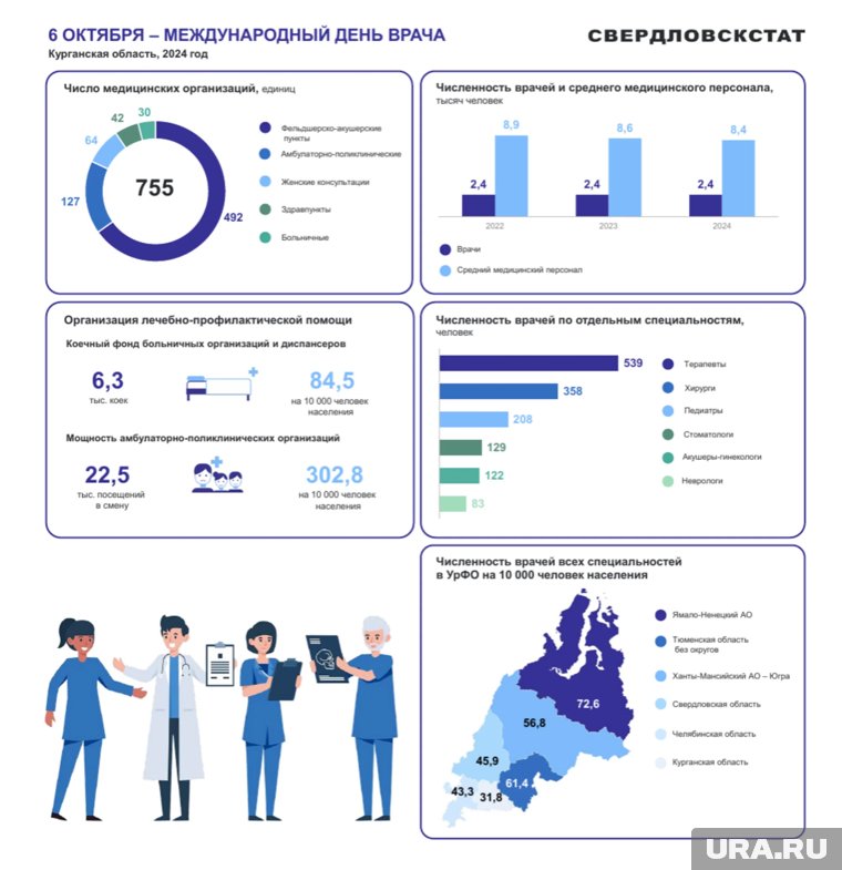 «Численность врачей по отдельным специальностям за 2024 год в Курганской области. Терапевты — 539 человек, хирурги — 358, педиатры — 208, стоматологи — 129, акушеры-гинекологи — 122, неврологи — 83», — пишет Свердловскстат. Общая численность на 10 тысяч человек составила 31,8 врача.