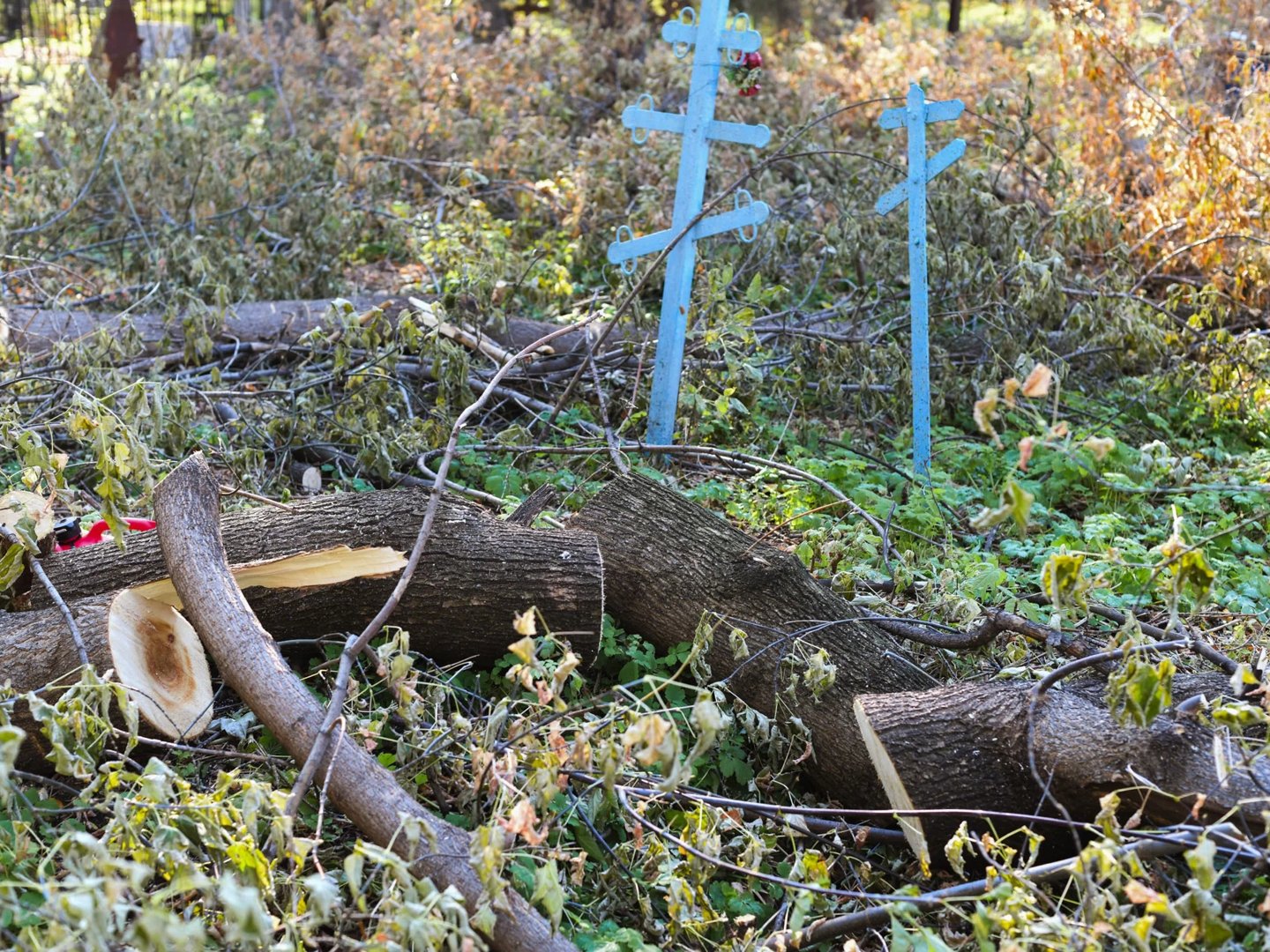 «На Текутьевском кладбище проводят работы по сносу деревьев. Часть веток, спила бревен упали на могилы. Также были замечены большие борозды от покрышек авто», — сообщает корреспондент агентства.