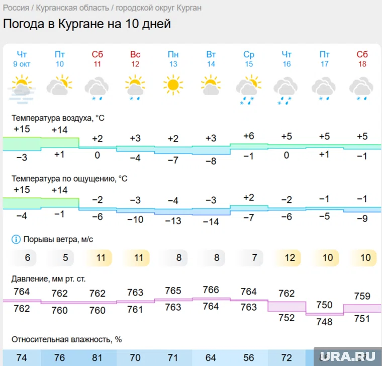 «Днем 9 октября в Кургане ожидается до плюс 15. На следующий день — до 14 градусов. В субботу и воскресенье — до плюс трех градусов днем и до минус четырех ночью. Вероятен мокрый снег с дождем», — указано в прогнозе Gismеteo. В выходные вместе с осадками ожидается и усиление ветра до 11 м/с.