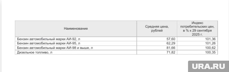 «Средние потребительские цены на отдельные товары и их изменение на 6 октября 2025 года в Курганской области. Бензин автомобильной марки АИ-92 подорожал на 1,36% (средняя цена — 57,60 руб), марки АИ-95 на 1,26% (средняя цена — 62,29 руб). Также подорожало дизельное топливо на 0,35% (средняя цена — 71,82 руб)», — пишет Свердловскстат.