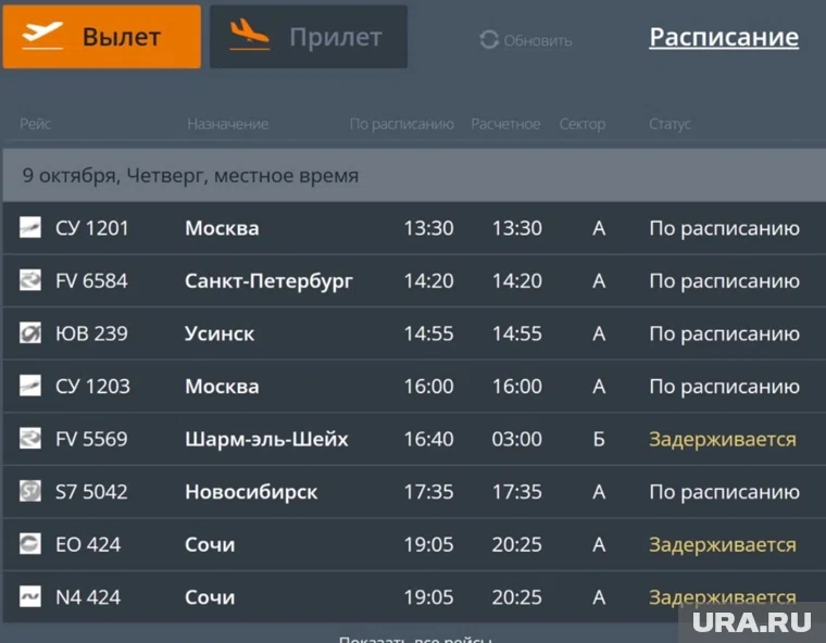 В пермском аэропорту на 10 часов задерживается рейс в Египет. Скрин