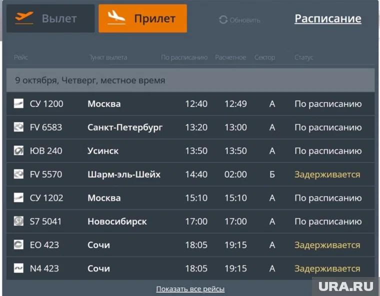Прибытие самолета из Шарм-эль-Шейха в Пермь ожидалось 9 октября в 14:40, однако фактическая посадка в столице региона произойдет только в 2:00 10 октября