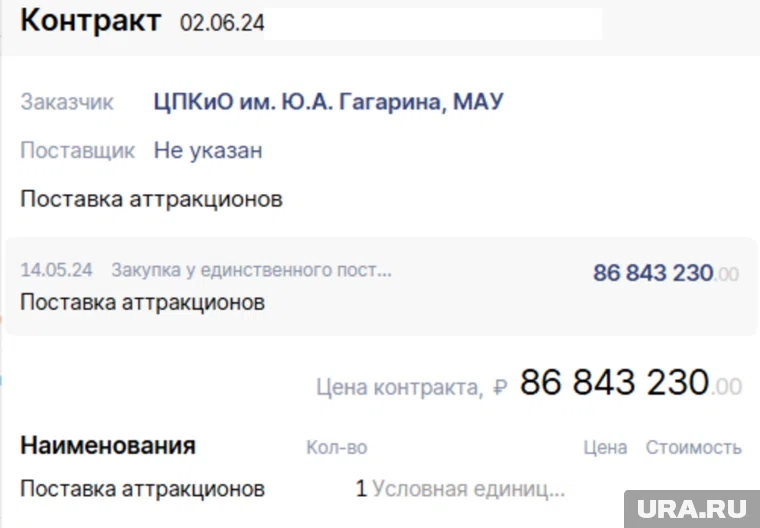 В сервисе СБИС корреспондент URA.RU нашел похожий контракт на сумму 86 млн 843 тысяч 230 рублей. Но поставщик аттракционов в нем не указан. Согласно сайту госзакупок, договор был заключен 3 июня 2024 года. При этом месяцем ранее была презентована новая «космическая» концепция Парка Гагарина.