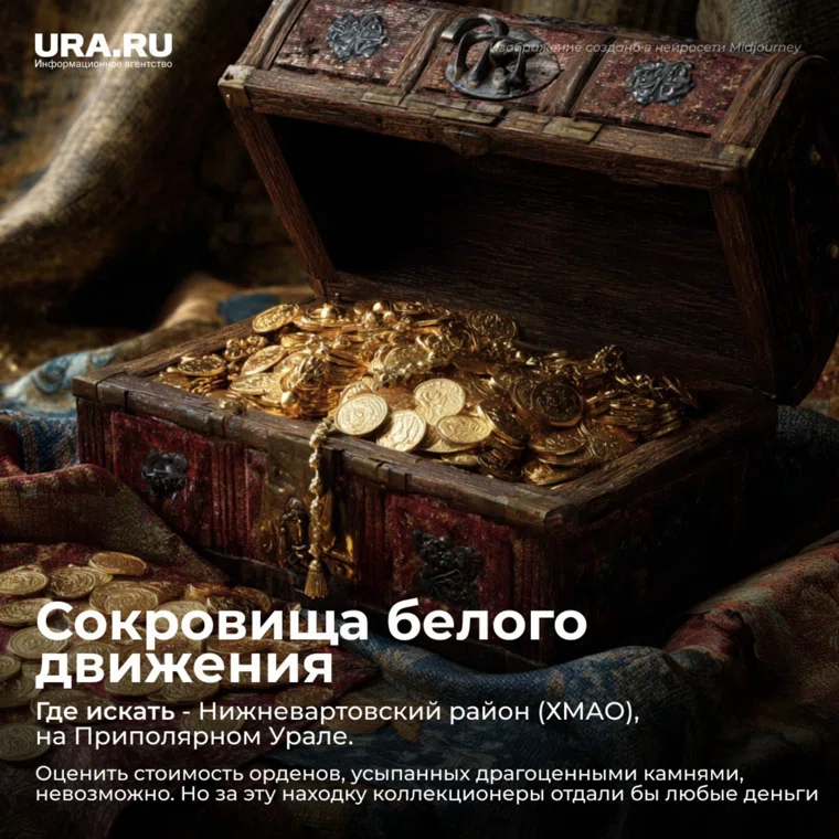 Обратимся к истории. В 1919 году ордена временного Сибирского правительства, усыпанные драгоценными камнями, погрузили на пароход в Тобольске. Отчеканенные они лежали в местных кладовых, но в итоге по решению того самого Колчака не были вручены. Когда Красные приближались к городу, было принято решение об эвакуации реликвий в Томск. По пути из-за ранней зимы судно вмерзло в лед возле Сургута (ХМАО). Здесь сокровища временно спрятали в надежде за ними вернуться. В итоге после всех исторических событий часть клада затерялась в Нижневартовском районе, часть — на Приполярном Урале.