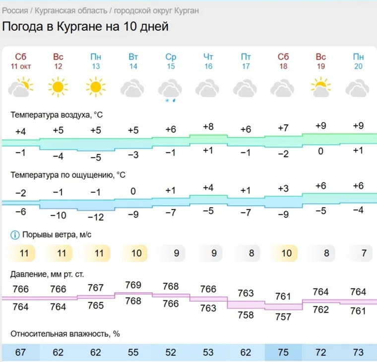 «В Кургане в воскресенье и понедельник будет ясно, затем наступит пасмурная погода. В среду вероятен небольшой мокрый снег. В Шадринске аналогичная погода, только снег с дождем вероятны на протяжении трех дней — со вторника по четверг», — сообщается в прогнозе Gismeteo.