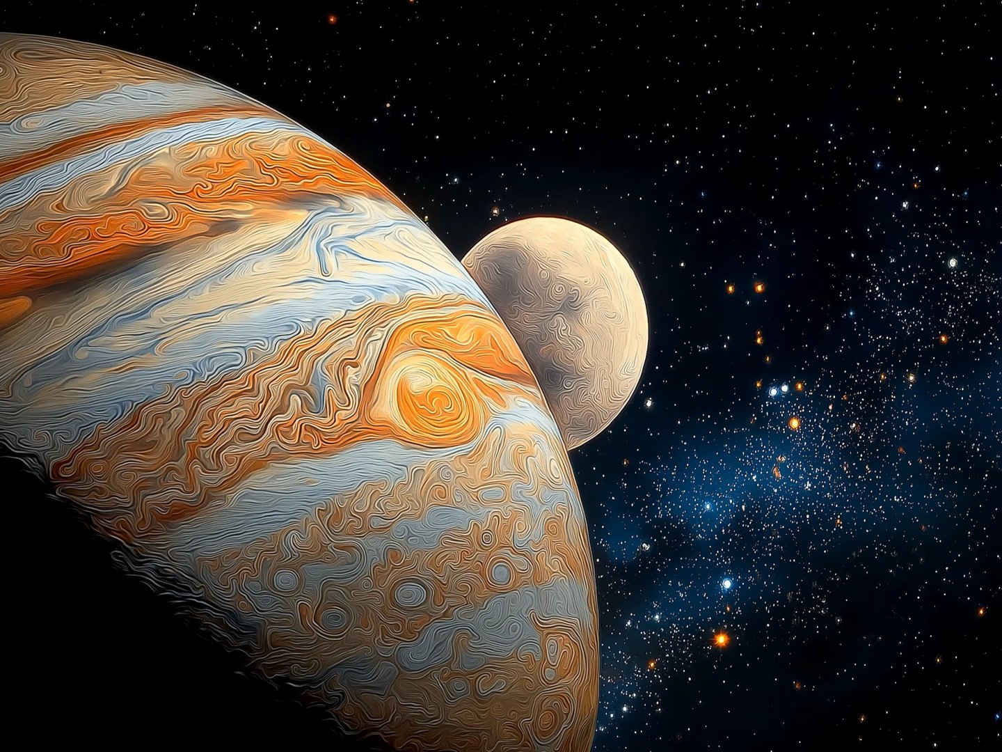 Астрономическое сближение — это не физическое приближение тел в пространстве, а оптический эффект: Луна и Юпитер просто оказываются на одной линии зрения с Земли. На самом деле их разделяет почти 700 миллионов километров.