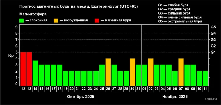 Согласно прогнозу, буря достигнет мощности G1 (слабая). Вероятность геомагнитных возмущений на 12 октября составляет 60%.
