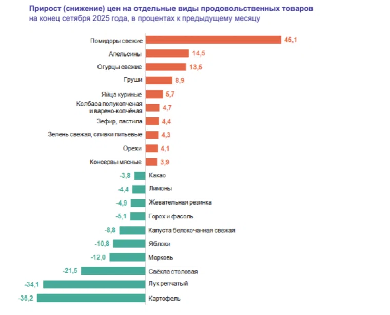 «Прирост (снижение) цен на отдельные виды продовольственных товаров на конец сентября 2025 года, в процентах к предыдущему месяцу. Подорожали помидоры на 45,1%, апельсины на 14,5%, огурцы на 13,5%, груши на 8,9%. Цены упали на картофель на 36,2%, лук репчатый 34,1%, свекла 21,5%, морковь 12%», — рассказали нам в ведомстве.