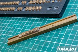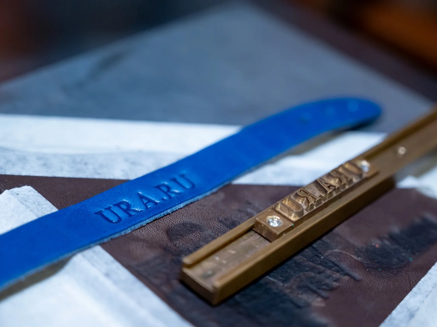 Пока браслет сохнет, определяемся со штампом: буквами, цифрами, рисунком. Мы решили отпечатать на браслете надпись «URA.RU», поэтому выбираем две буквы «U», две — «R», одну — «А» и точку. Кладем их на клише в зеркальном порядке и собираем на планку. Проверяем, чтобы надпись на планке была ровно по центру.