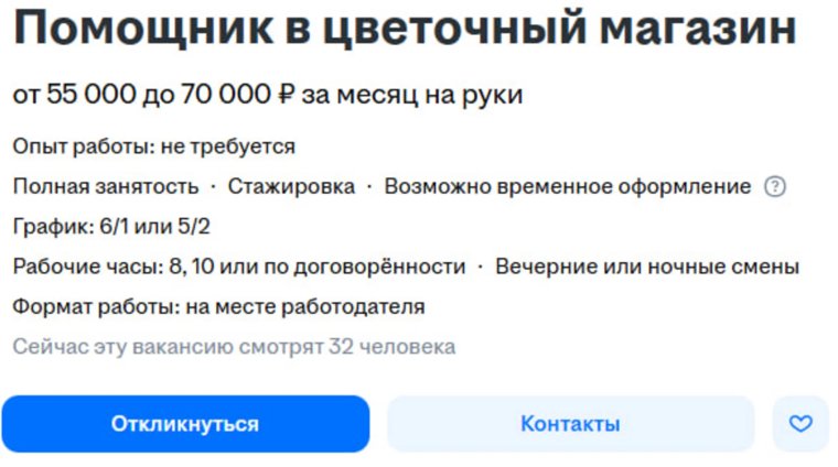 Помощнику в цветочном магазине готовы предложить до 70 000 рублей за месяц. Работодатель предлагает только полную занятость, однако время работы можно корректировать.