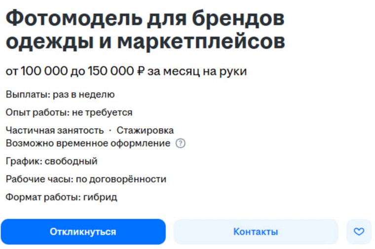 Для рекламы брендов одежды на маркетплейсах ищут фотомодель. График работы, как заявляется, свободный, а зарплата может достигать 150 тысяч рублей. Одно из требований к кандидатам: фотогеничность, также нужно уверенно чувствовать себя перед камерой.