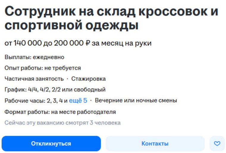 Сотрудникам на складе кроссовок и спортивной одежды предлагают от 140 до 200 000 рублей в месяц. Выплаты обещают ежедневные, а работать можно два через два. В обязанности входит размещение товаров на складе и их сборка.