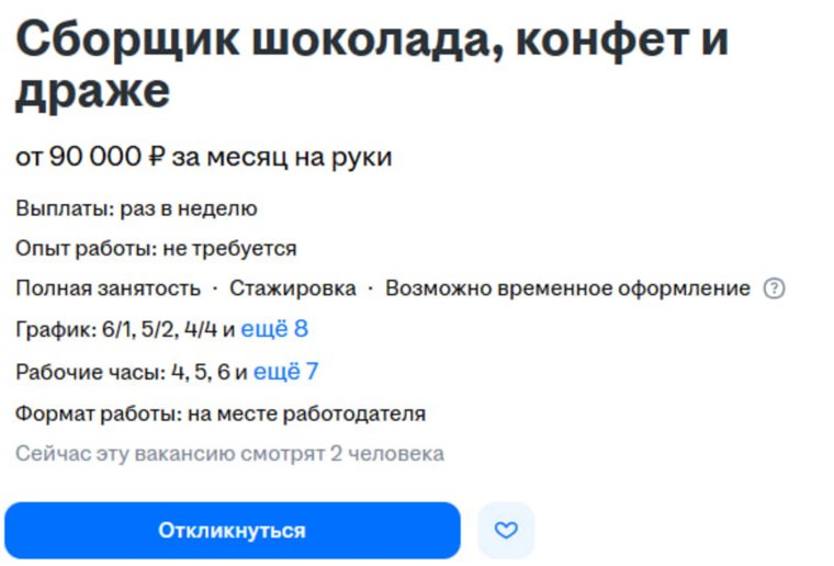 Собирать шоколад, конфеты и драже зовут студентов и тех, кто ищет подработку. В вакансии указано, что зарплата начинается от 90 000 рублей в месяц, работать можно о четырех часов в день.