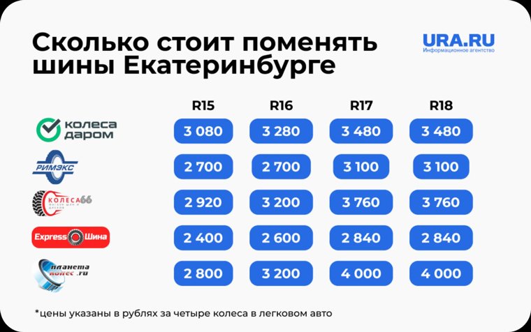 В Екатеринбурге цены на шиномонтаж к зиме варьируются от 2400 до 4000 рублей, такая стоимость актуальна для шин диаметром от 15 до 18 дюймов. URA.RU подготовило инфографику с ценами в популярных шиномонтажных мастерских города.