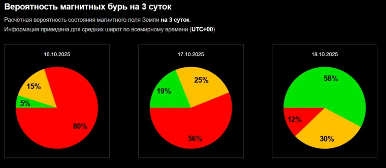 Вероятность сохранения магнитной бури составляет 80%, возбужденной магнитосферы — 15%. Даже после снижения интенсивности до «зеленого» уровня (3-4 балла) метеозависимые люди могут ощущать последствия геомагнитных возмущений.