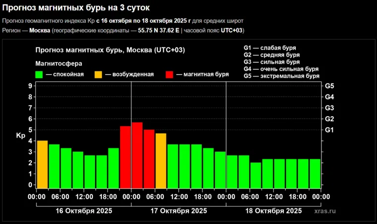 Однако к восьми часам вечера ситуация снова начнет ухудшаться. Активность начнет расти и перерастет в полноценную магнитную бурю силой в 5 баллов. А вот самый пик придется на ночь — после полуночи 17 октября магнитосферу будет «штормить» уже сильнее пяти баллов.