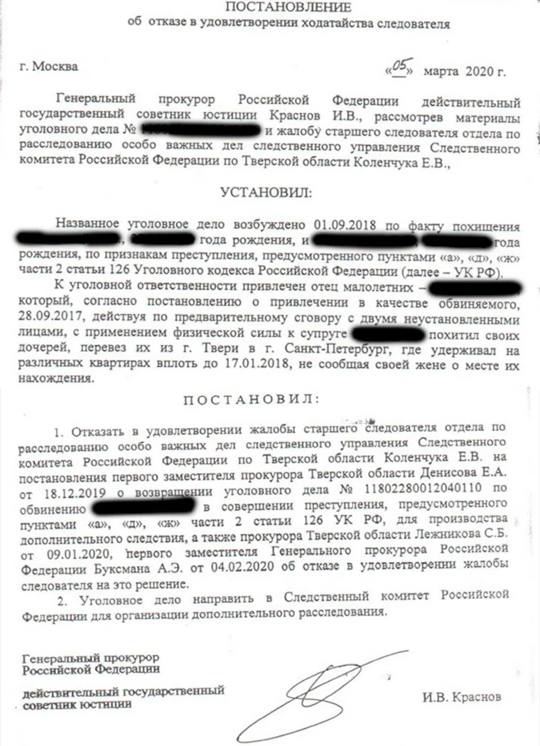 Александр Петрикин сообщил, что бывший генпрокурор РФ Игорь Краснов (сейчас занимает должность председателя Верховного Суда РФ) ранее уже отказывал в утверждении обвинительного заключения по идентичному уголовному делу. «Из постановления следует, что абсолютно вся вертикаль нижестоящих прокуроров и сам, на тот момент генеральный прокурор РФ, однозначно выразили позицию о том, что родитель не может быть субъектом преступления „похищение человека“. Аналогичные позиции выражали и депутаты Государственной думы Елена Мизулина и Павел Крашенинников. В 2010-х по инициативе законодателя была введена в действие статья 5.25 КоАП РФ, которая устанавливает исключительно административную, а не уголовную ответственность именно за то, что случилось в ситуации [Кирилла]. То есть, за нарушение порядка общения с ребенком, установленного судом», — объяснил адвокат.