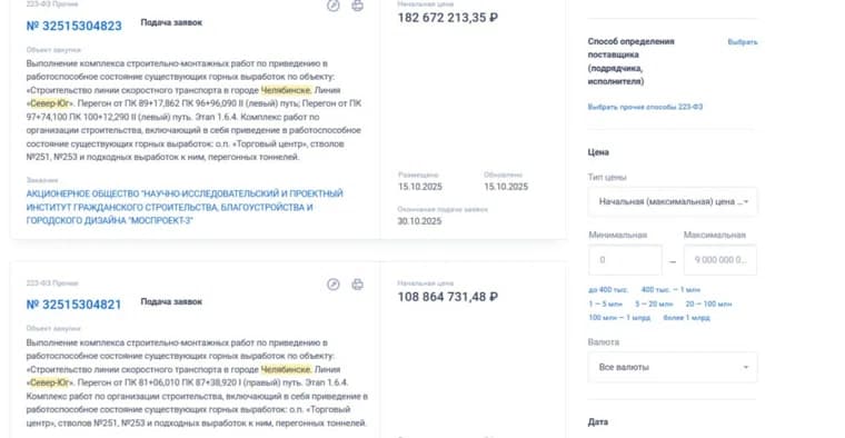 «Комплекс работ по организации строительства, включающий в себя приведение в работоспособное состояние существующих горных выработок: о.п. „Торговый центр“, стволов №251, №253 и подходных выработок к ним, перегонных тоннелей», — говорится в описании заявки на сайте «Госзакупок». Всего размещено два конкурса по поиску подрядчика с суммами контрактов 182 и 108 миллионов рублей.