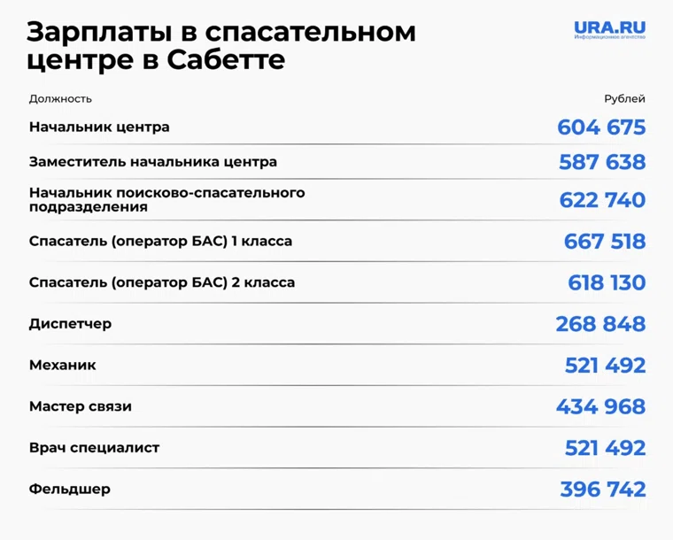 Зарплаты начальника и его заместителя составят около 600 тысяч рублей. Спасатели и операторы БАС получают больше. Например, спасатель 1 класса сможет претендовать на сумму в 667 тысяч рублей. Врачу-специалисту и механику полагается 527 тысяч рублей, а фельдшеру — почти 400 тысяч рублей. Меньше всего заработает диспетчер — в конце вахты он получит 269 тысяч рублей.