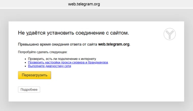 Кроме того, замечены и проблемы в работе мессенджера Telegram. У него работает мобильная версия, а вот с компьютера проблема та же, что и у WhatsApp*.