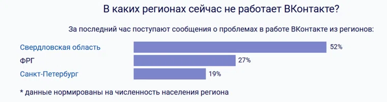 Согласно сервису detector404, который отслеживает работу интернет-ресурсов в России, проблемы также наблюдаются в Санкт-Петербурге и других регионах страны. Также сложности к доступу к «ВКонтакте» испытывают жители ФРГ (Германия).