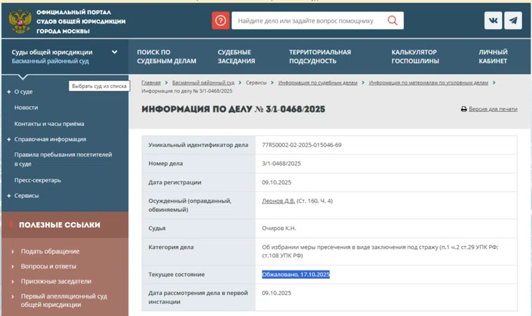 «Обвиняемый — Леонов Д.В. (ст.160 ч.4). Категория дела — об избрании меры пресечения в виде заключения под стражу. История состояний — обжаловано», — сообщается на сайте районного суда Москвы. Жалоба от бывшего заместителя главного пристава Курганской области на арест поступила 17 октября.