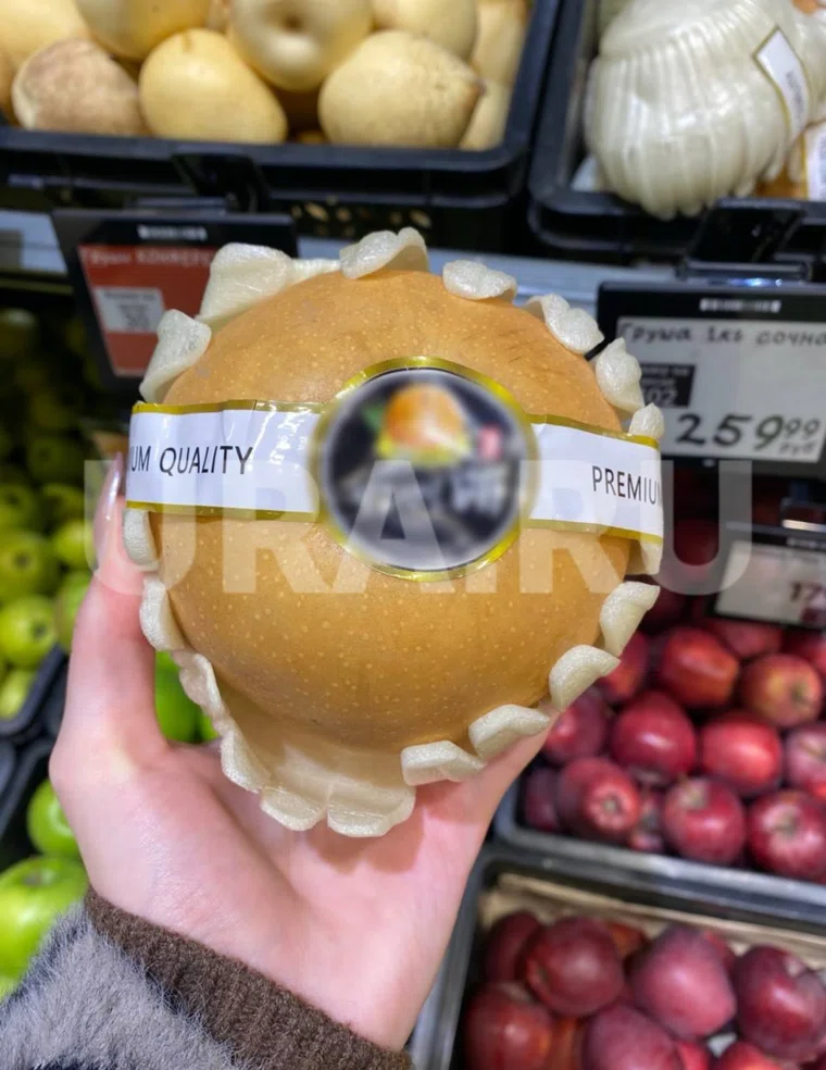«Экзотический фрукт продают на развес. Цена за килограмм — около 250 рублей. На наклейках, прикленных к плодам, написано, что груши из Кореи», — передает корреспондент URA.RU. Судя по внешнему виду, этот сорт азиатской груши называется «Олимпик», он созревает в сентябре.