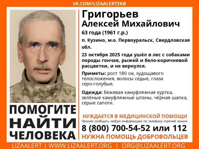 «Пропал Григорьев Алексей Михайлович, 63 года (1961 года рождения) поселок Кузино м.о. Первоуральск Свердловская область. 23 октября 2025 года ушел в лес с собаками породы гончая, рыжей и бело-коричневой расцветки, и не вернулся», — рассказали волонтеры.