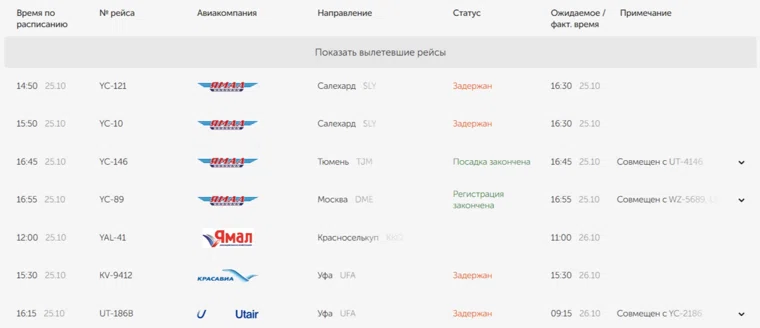 Согласно информации ресурса, не были выполнены рейсы YC-121 (время отправления 14:50) и YC-10 (15:50) в Салехард, а также KV-9412 (15:30) и YAL-41 (16:15) в Уфу. Причины задержки на сайте не уточняются.