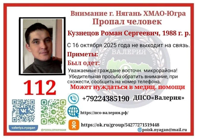 В Нягани (ХМАО) с 16 октября продолжаются поиски Кузнецова Романа Сергеевича 1988 года рождения. Мужчина не выходит на связь. Об этом написали в telegram-канал поискового отряда «Валерия».