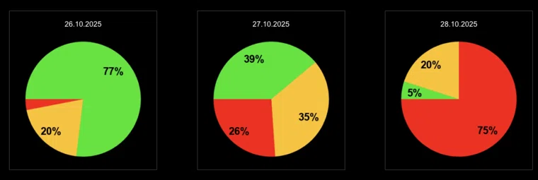 Однако уже во вторник, 28 октября, ожидается резкий всплеск геомагнитной активности. Через два дня индекс геомагнитной активности резко подскочит, а вероятность магнитной бури повысится до 75%.
