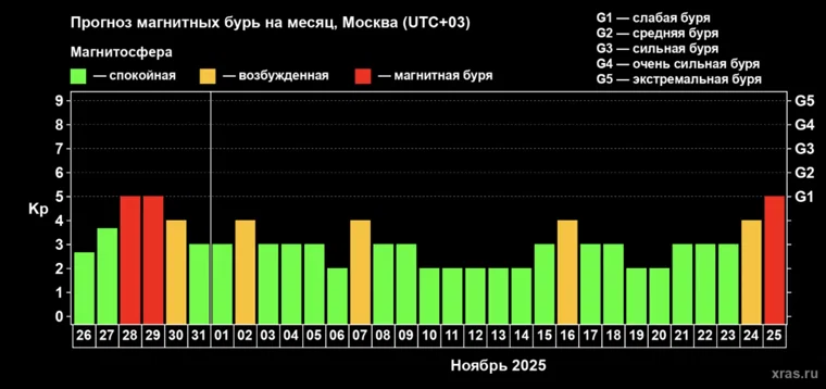 Следующие периоды повышенной активности ожидаются 2, 7, 16 и 24 ноября. 25 числа ученые прогнозируют магнитную бурю уровня G1. В остальные дни магнитосфера будет преимущественно спокойной.