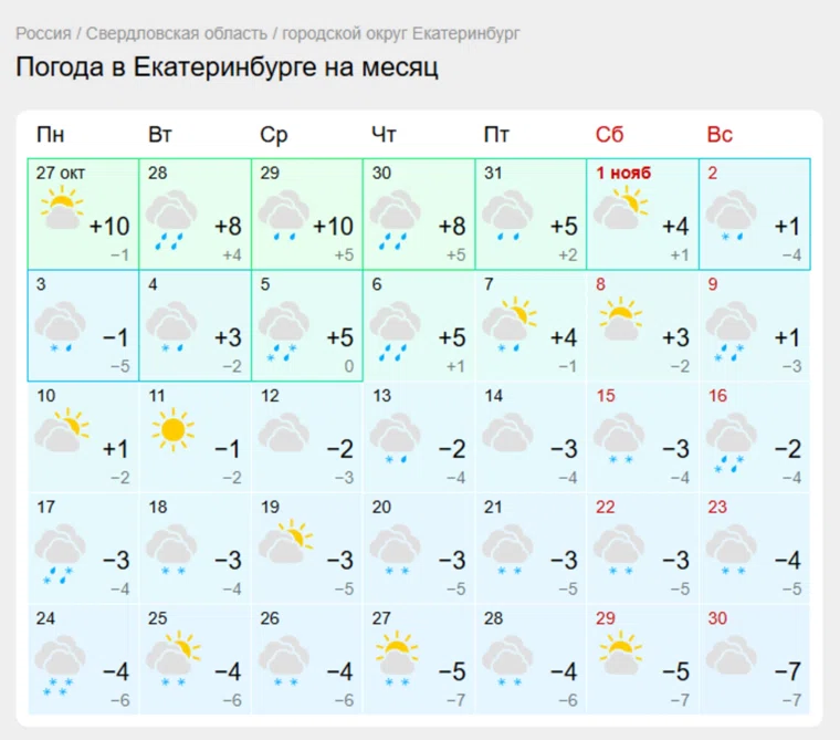Во второй половине ноября в Свердловской области похолодает и пойдет снег. Это следует из прогноза погоды на сервисе Гисметео.